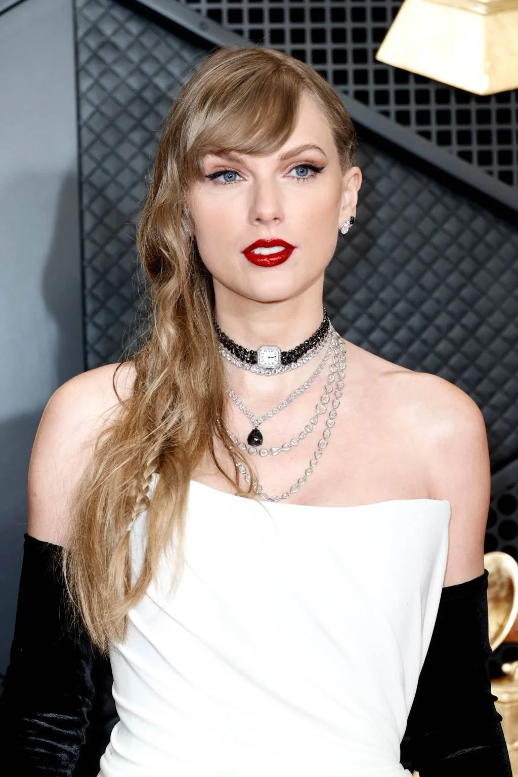 Taylor announced her new album while dressed in a strapless white couture Schiaparelli gown. She layered black and white diamond jewelry, by Lorraine Schwartz. Completing the look with a watch choker, significantly set to “midnight.”